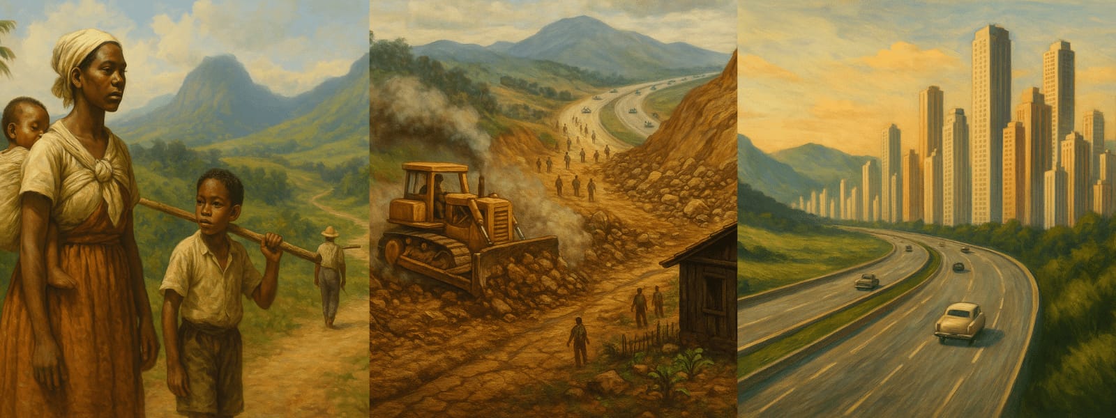 A trajetória do quilombo é entrelaçada pelas ausências do passado e pelos impactos do presente. Quando a BR-101 cortou o morro, nos anos 1970, explosões, rachaduras e a falta de consulta pública marcaram a vida das famílias. A cidade cresceu, a estrada duplicou, mas a comunidade resistiu — mesmo quando a paisagem ao redor se transformou em concreto e velocidade.