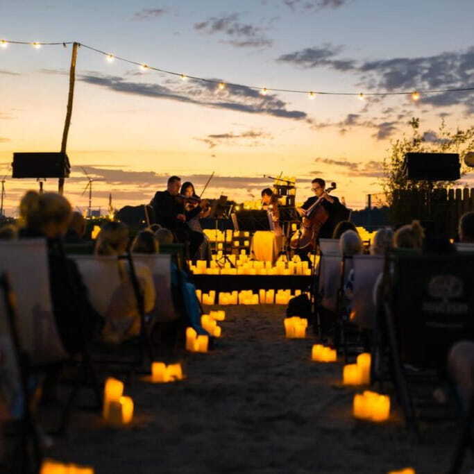 Uma experiência gastronômica única beira-mar: menu em quatro tempos harmonizado com vinhos internacionais e trilha ao vivo com repertório clássico em ambiente iluminado por velas.