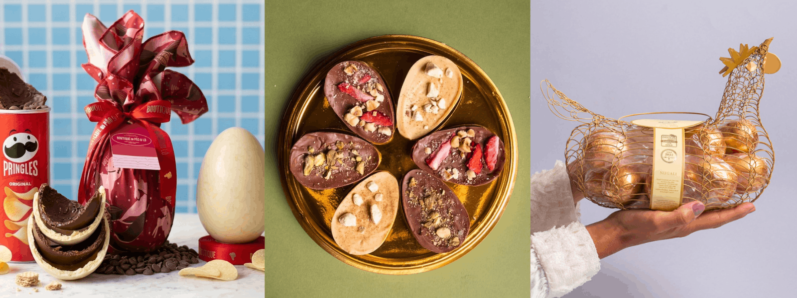 O Ovo Chips ganhou destaque este ano: metade chocolate belga ao leite, metade branco, com batatas chips crocantes dentro. O contraste doce e levemente salgado é o diferencial. A boutique não erra nunca!